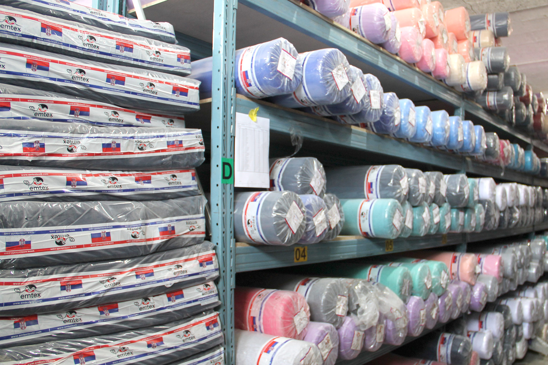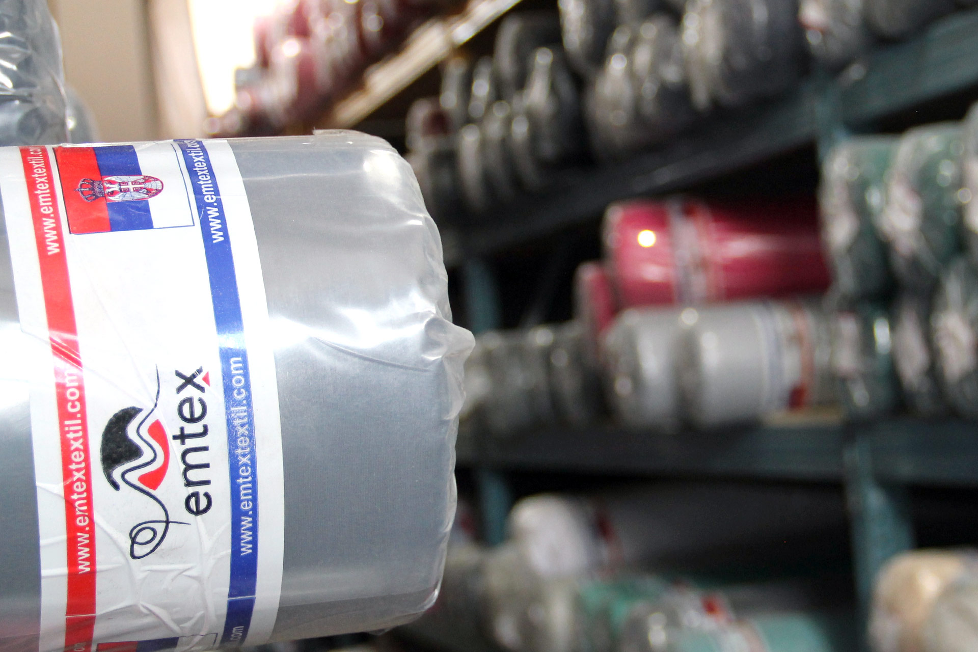 Na svom lageru sa preko 4000 m2 u više magacina u Novom Pazaru i Pančevu, Emtex uvek ima preko 300 tona materijala na lageru čto govori o našoj ozbiljnosti i mogućnosti redovnih isporuka, cak i najvećim proizvodnim sistemima kako u zemlji tako i u zemljama u okruženju. Naš širok prodajni asortiman konstantno dopunjujemo i sa novim i modernim materijalima koji su utrendu na svetskom tržištu, ne zanemarujući već oprobane i tradicionalne materijale koje godinama ponavljamo na zahteve velikog broja zadovoljnih kupaca. Celokupna paleta proizvoda je izuzetnog kvaliteta i dizajna sa postojanim bojama, a uradjena po ISO standardima sa OEKO TEX sertifikatom.