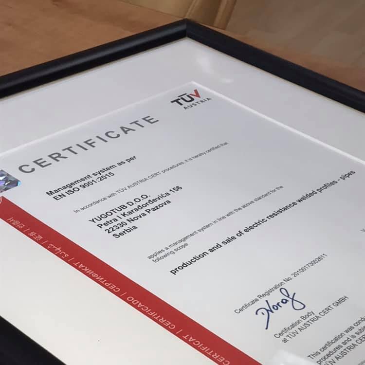 - Yugotub je sertifikovana kompanija u skladu sa standardom ISO 9001:2015